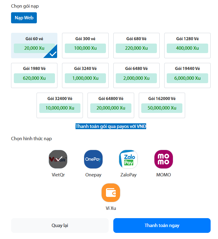 - Học Viên dùng Vé Nạp để mua các gói Ingame