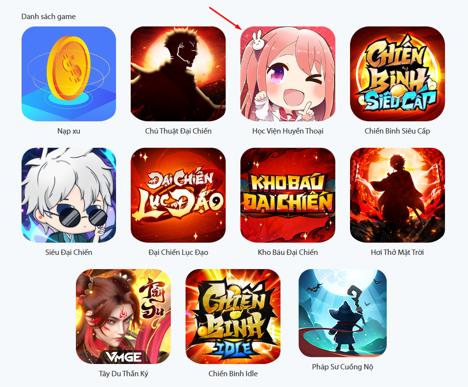 - Tại giao diện này, Học Viên chọn game Học Viện Huyền Thoại để bắt đầu tiến trình nạp vé vào game